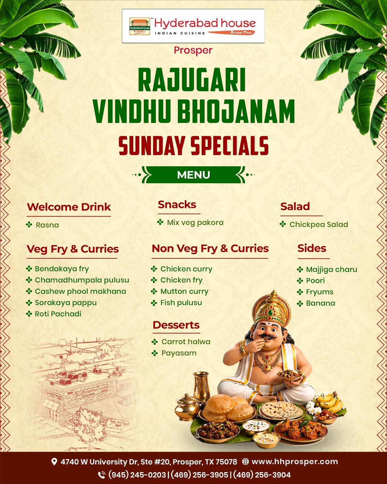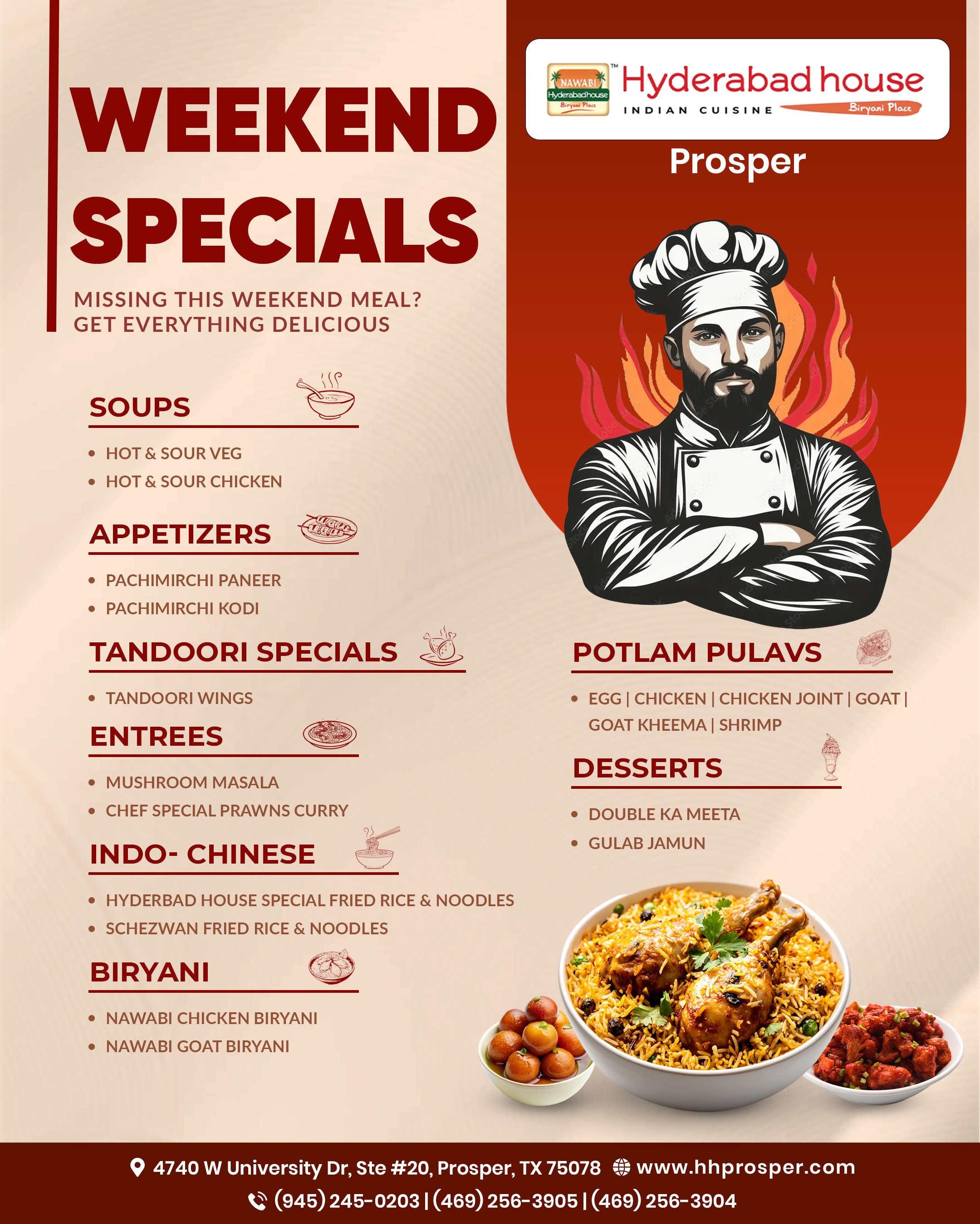 Hyderabad House is a popular Indian restaurant chain located in IN USA, CANADA, EUROPE & UK Now coming to Prosper, TX - United States. Known for its authentic Hyderabadi cuisine, Hyderabad House offers a diverse menu that showcases the flavors and spices of the Indian city of Hyderabad.